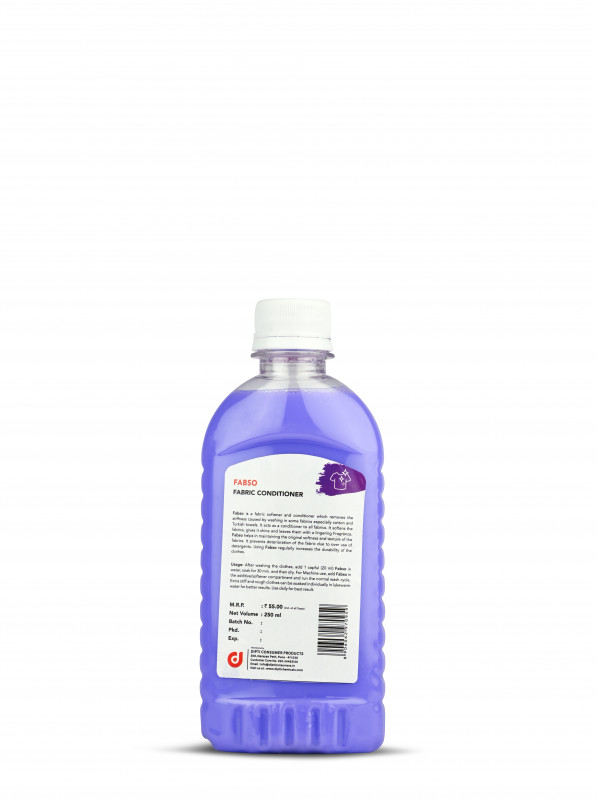 Fabso is a fabric softener and conditioner which removes the stiffness caused by washing in some fabrics especially cotton and Turkish towels. It acts as a conditioner to all fabrics. It softens the fabrics, gives it shine and leaves them with a lingering Fragrance. Fabso helps in maintaining the original softness and texture of the fabrics. It prevents deterioration of the fabric due to over use of detergents. Using Fabso regularly increases the durability of the clothes.