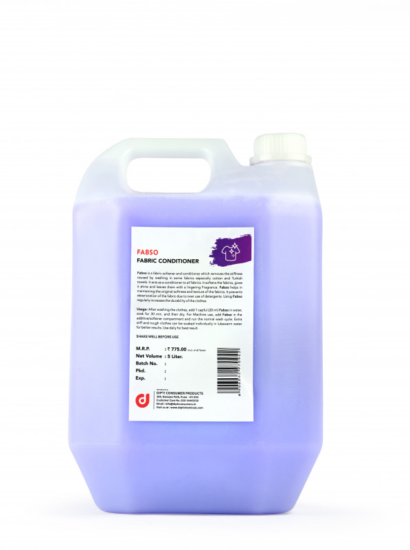 Fabso is a fabric softener and conditioner which removes the stiffness caused by washing in some fabrics especially cotton and Turkish towels. It acts as a conditioner to all fabrics. It softens the fabrics, gives it shine and leaves them with a lingering Fragrance. Fabso helps in maintaining the original softness and texture of the fabrics. It prevents deterioration of the fabric due to over use of detergents. Using Fabso regularly increases the durability of the clothes.