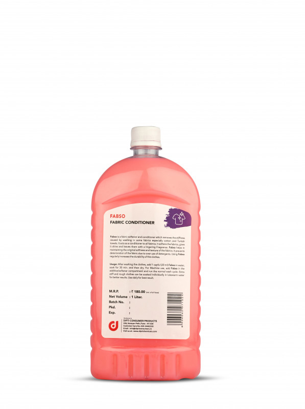 Fabso is a fabric softener and conditioner which removes the stiffness caused by washing in some fabrics especially cotton and Turkish towels. It acts as a conditioner to all fabrics. It softens the fabrics, gives it shine and leaves them with a lingering Fragrance. Fabso helps in maintaining the original softness and texture of the fabrics. It prevents deterioration of the fabric due to over use of detergents. Using Fabso regularly increases the durability of the clothes.