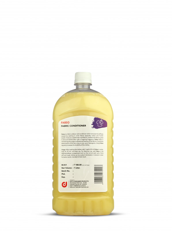 Fabso is a fabric softener and conditioner which removes the stiffness caused by washing in some fabrics especially cotton and Turkish towels. It acts as a conditioner to all fabrics. It softens the fabrics, gives it shine and leaves them with a lingering Fragrance. Fabso helps in maintaining the original softness and texture of the fabrics. It prevents deterioration of the fabric due to over use of detergents. Using Fabso regularly increases the durability of the clothes.