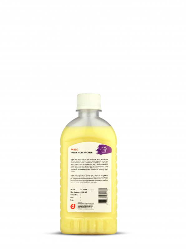 Fabso is a fabric softener and conditioner which removes the stiffness caused by washing in some fabrics especially cotton and Turkish towels. It acts as a conditioner to all fabrics. It softens the fabrics, gives it shine and leaves them with a lingering Fragrance. Fabso helps in maintaining the original softness and texture of the fabrics. It prevents deterioration of the fabric due to over use of detergents. Using Fabso regularly increases the durability of the clothes.