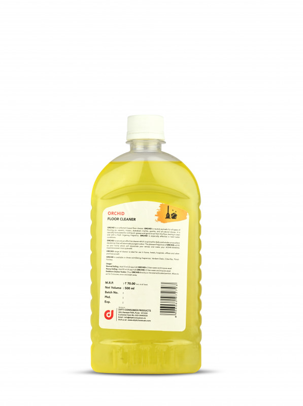 Orchid is a surfactant based floor cleaner. Orchid is neutral and safe for all types of flooring viz. ceramic, mosaic, shahabad, marble, granite, and all natural stones. It is specially formulated for cutting oil, grease and general soil from the floor, leaving it clean and with a fresh lingering fragrance. Orchid is especially effective in hard water conditions. Orchid is not only an effective cleaner which is optimal for daily use but also an excellent deodorizer that will eleminate pungent odour. The pleasant fragrance of Orchid will fill up your home which will rejuvenate your senses and make your HOME-MAKING experience even more splendid. Orchid range of cleaner is ideal for use in home, hotels, hospitals, offices and other premises as well. Orchid is available in 5 scintillating fragrances: Verdant-Oasis, Citra-Dip, Floral Fantasy, Sandal Delight & Lemongrass